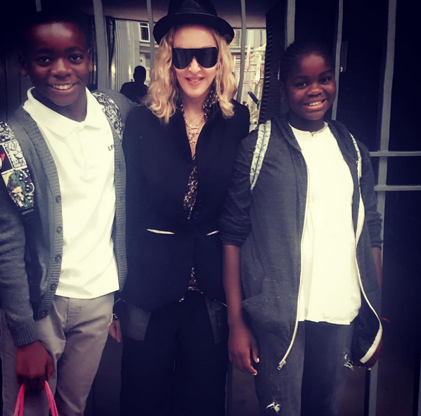 “Primeiro dia de escola!! Estou bem com quatro horas de sono, juro!”, revelou, posando ao lado dos filhos adotados David e Mercy.