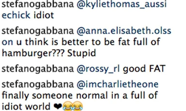 “Querida, preferes estar gorda e cheia de colesterol??? Creio que tens um problema”, “Idiota” e “Achas que é melhor ser gordo e encher-se de hambúrgueres? Estúpido” foram algumas das respostas dadas por Stefano Gabbana.