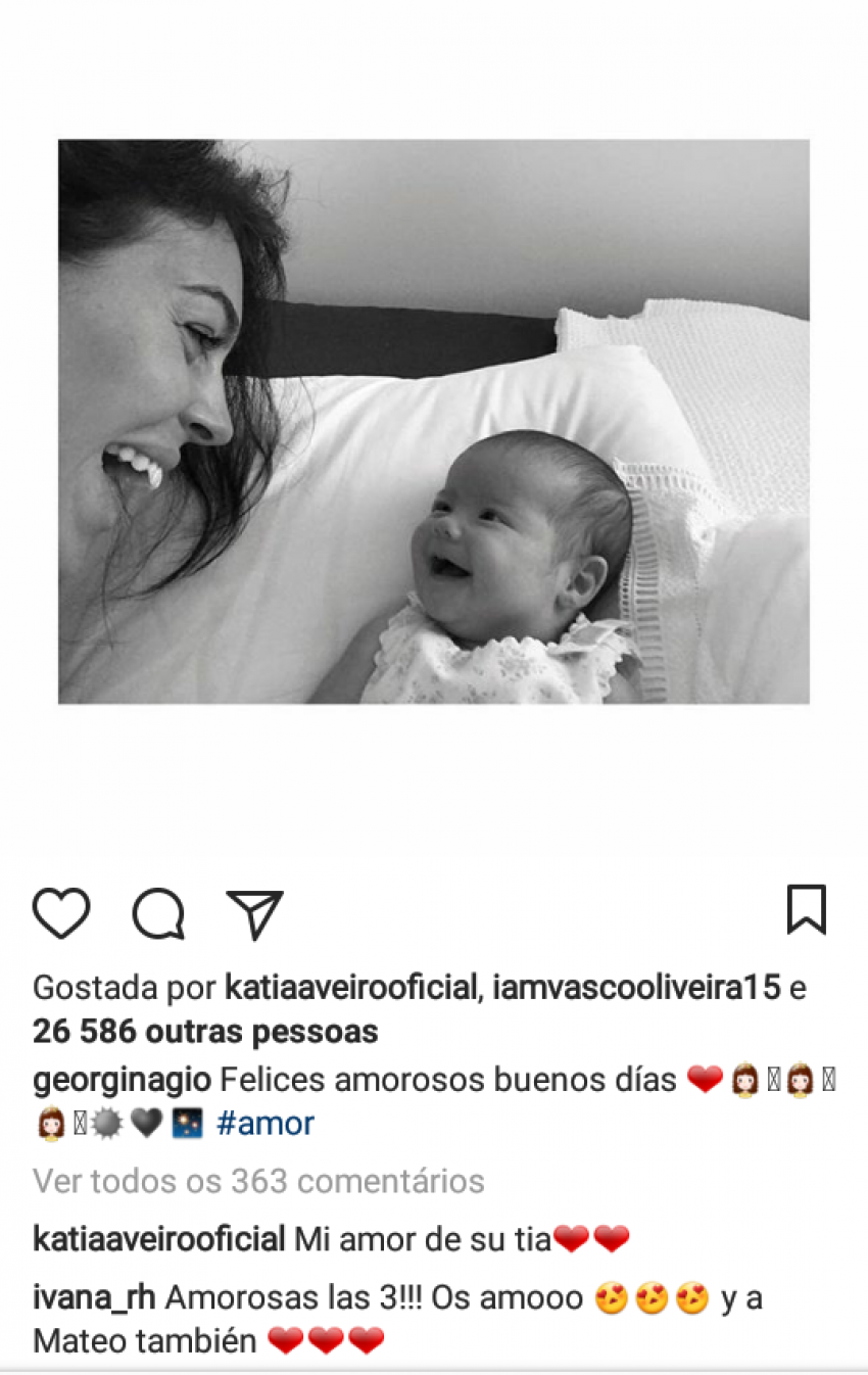 Georgina Rodríguez mostra-se, na legenda, perdida de amores pela gémea de Mateo e, nem cinco minutos tinham passado desde a partilha, quando Kátia Aveiro e Ivana Rodríguez comentaram a publicação.