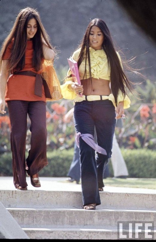 O unissexo e os jeans ganharam força, assim como o aparecimento da mini-saia, as meias-calças coloridas e as calças à boca-de-sino.