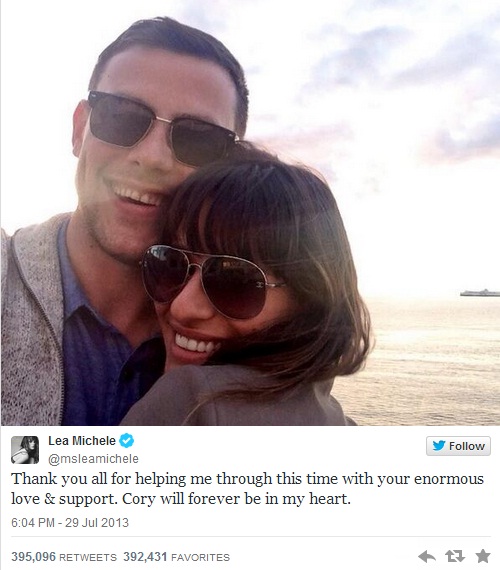 O tweet em que a atriz agradece o apoio dos fãs pouco após a morte do seu namorado, Cory Monteith, foi o mais retweetado do ano, informou o Twitter na quinta-feira, dia 12. A mensagem da estrela de “Glee” – a primeira de Lea sobre o sucedido – foi retransmitida 408.000 vezes em 133 países.
