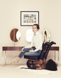 Na imagem, vê-se Dasha Zhukova, noiva o milionário russo Roman Abramovich, sentada numa cadeira que ao que tudo indica é uma mulher negra. No entanto, é uma escultura.