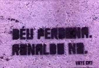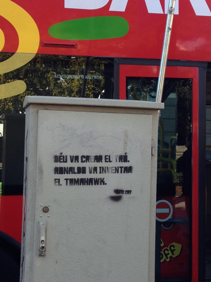 Na capital da Catalunha podem ler-se frases como “Deus perdoa, Ronaldo não”, “Deus é perfeito, Ronaldo melhora todos os dias” ou “Deus criou o trovão, Ronaldo criou o tomahawk”. Mas tudo escrito em catalão e com um apelo final: “Vote CR7”.