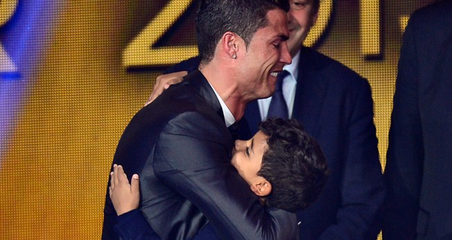 Ao receber o troféu das mãos de Pelé, que anunciou o vencedor, o capitão da seleção nacional foi surpreendido pelo filho, que correu para o palco para lhe dar um abraço.