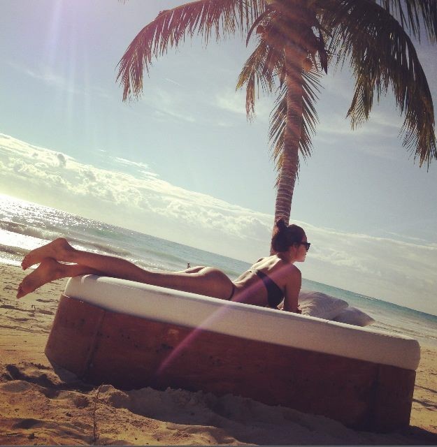 Numa das fotos pode-se ver a namorada de Cristiano Ronaldo a apanhar sol na praia e noutra surge ao lado da modelo Nadejda Savcova a tomar uma bebida junto ao mar.