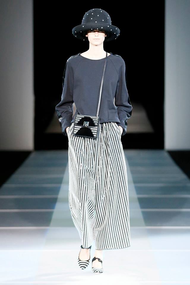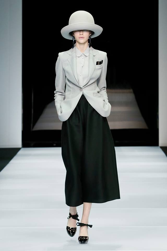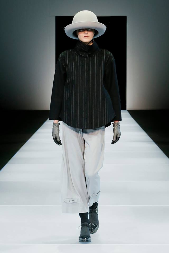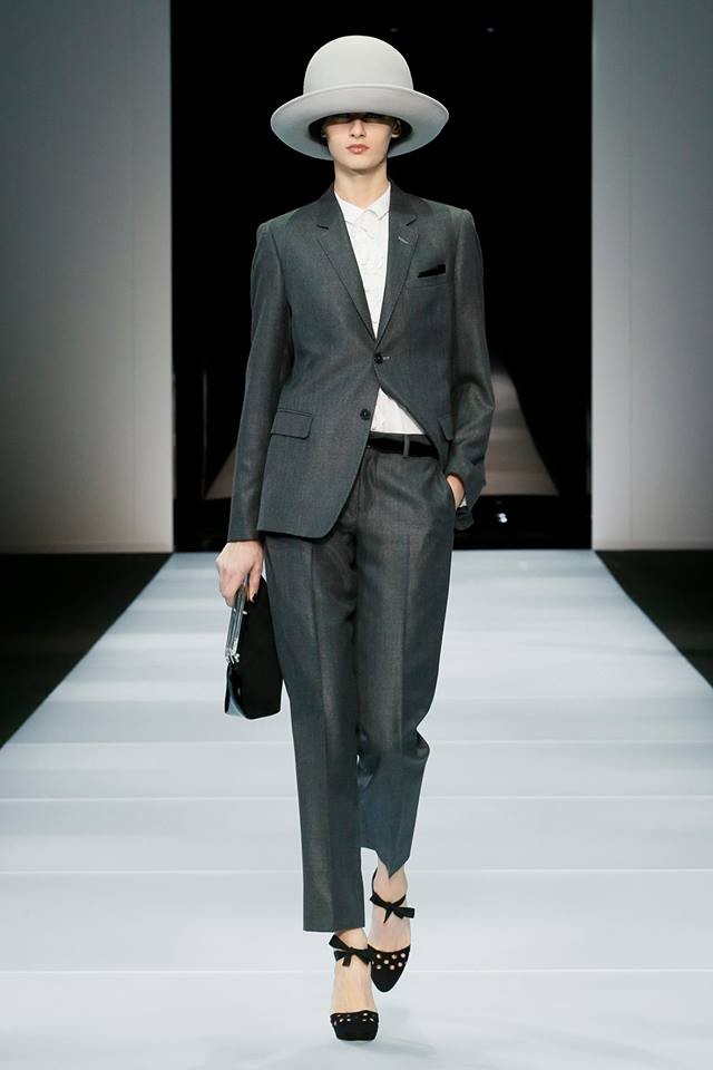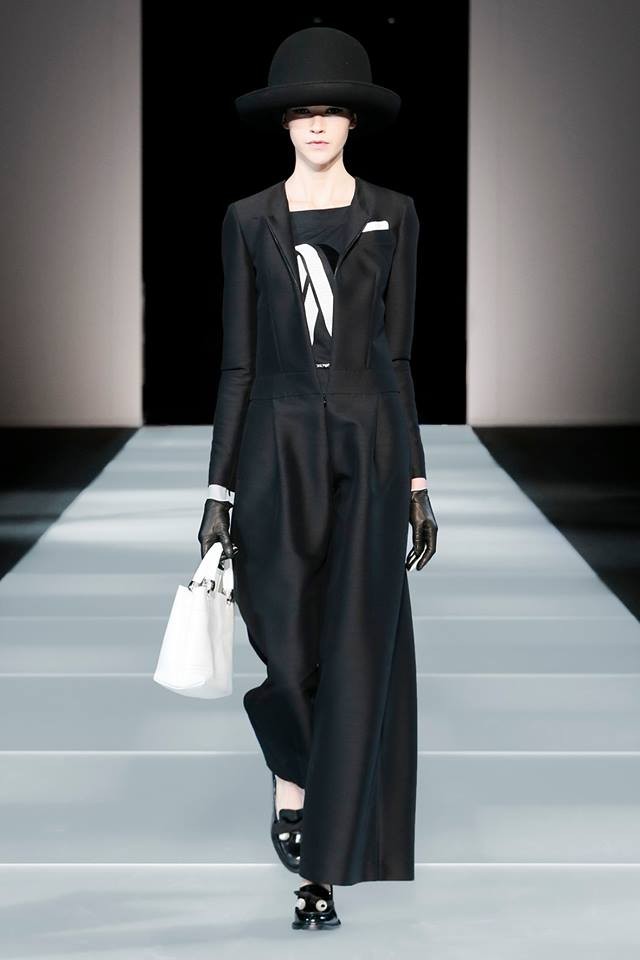 Em destaque esteva a impecável alfaiataria tradicional, na passarela de inverno 2015 da marca. A cor dominante da Emporio Armani para a próxima estação, é a clássica dupla preto & branco, com toques de turquesa e verde. O acessório é o chapéu coco.