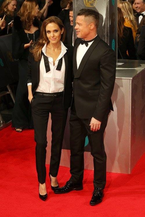 Angelina Jolie e Brad Pitt optaram por usar um look semelhante para a cerimónia, que se realizou na Royal Opera House, em Londres.