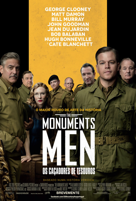Sinopse: Baseado na história verídica da maior caça ao tesouro de sempre, «The Monuments Men – Caçadores de Tesouros» centra-se num improvável pelotão da Segunda Guerra Mundial, enviado para a Alemanha a fim de resgatar grandes obras de arte de ladrões nazis e devolvê-las aos seus legítimos proprietários. Seria uma missão impossível: com a arte presa para lá das linhas inimigas e com o exército alemão com ordens para destruir tudo durante a queda do Reich, como poderiam estes homens – sete diretores de museus, curadores e historiadores de arte, mais familiarizados com Michelangelo que com armas – ser bem sucedidos? Ao se encontrarem numa corrida contra o tempo para evitar a destruição de 1.000 anos de cultura, os chamados Caçadores de Tesouros arriscam as suas vidas, para proteger e defender as melhores obras criadas pelo homem.