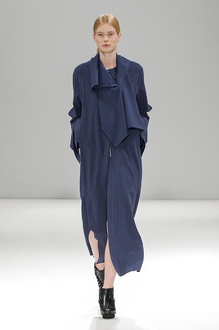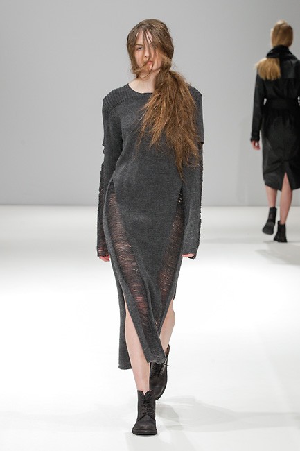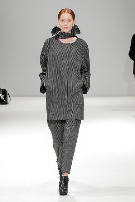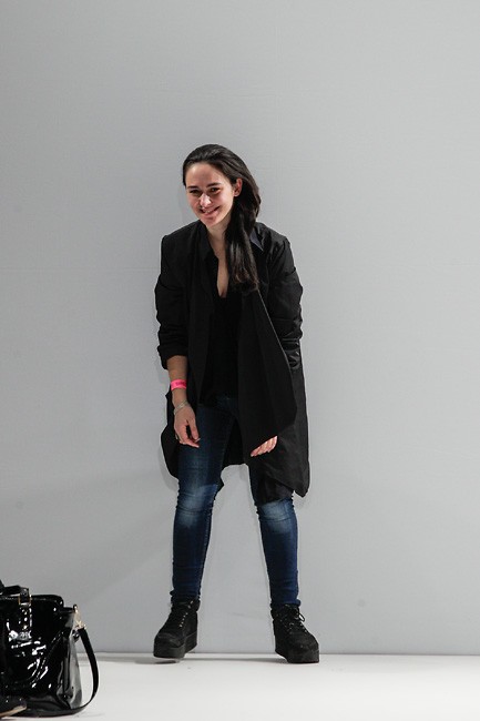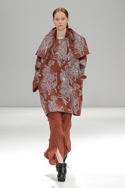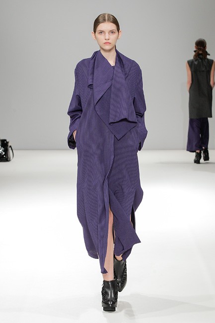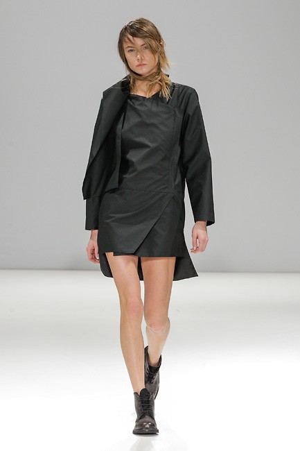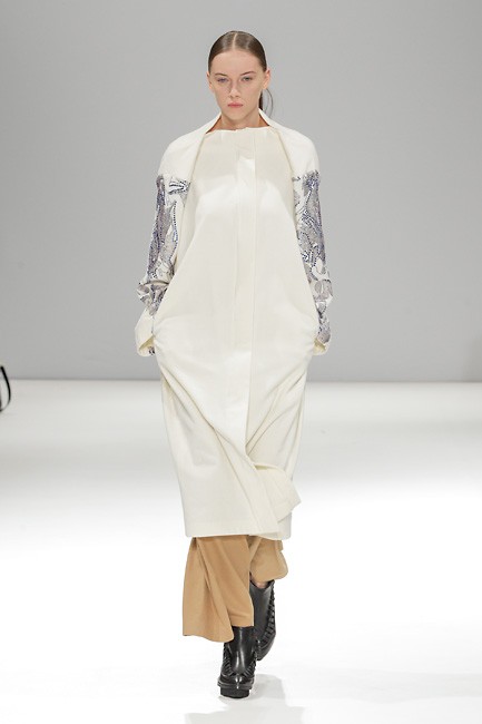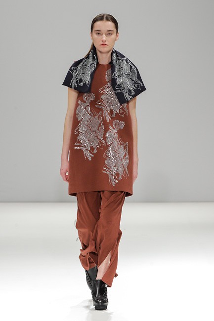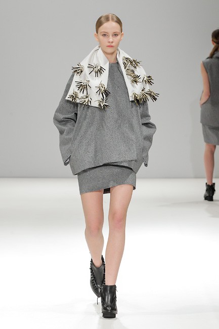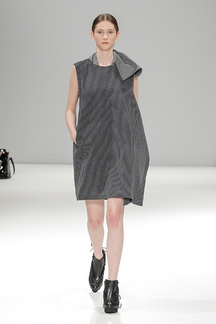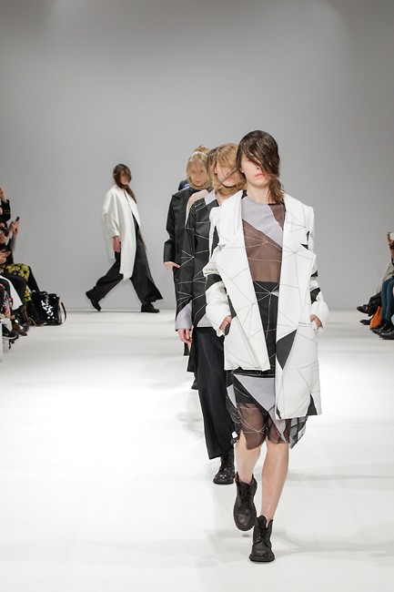 Daniela Barros levou a Londres a coleção “Dalka”, em que “apresenta uma silhueta forte e austera, onde a geometria e rigidez dos cortes aludem à química e à ligação dos seus elementos”. Num contraste entre materiais de cariz tecnológico e matérias de fibras naturais ou seda, a jovem designer explica que “a silhueta invoca a energia do caráter e do look feminino inspirado nas guerreiras históricas femininas, composta por várias camadas e linhas andrógenas”. “Blocos de cor são balançados por estampados que refletem a tridimensionalidade e visão microscópica; o preto e o cobalto são iluminados pelo branco”, acrescentou.