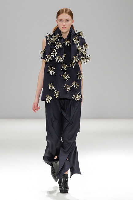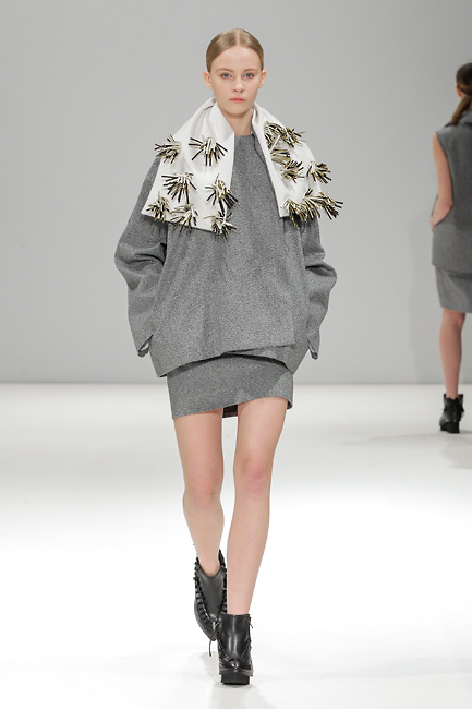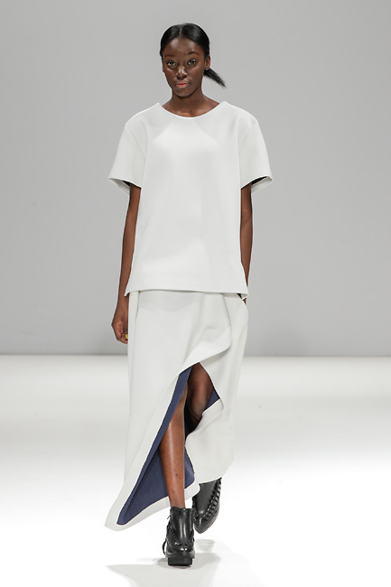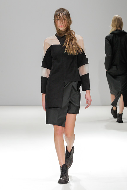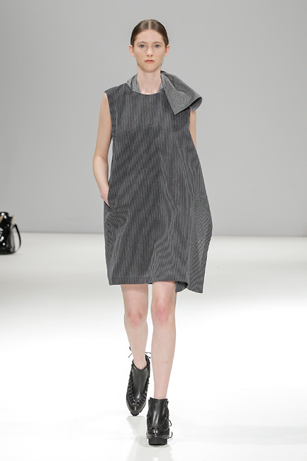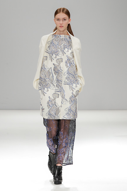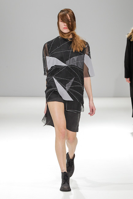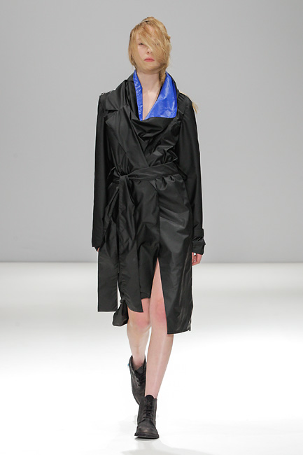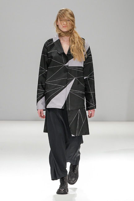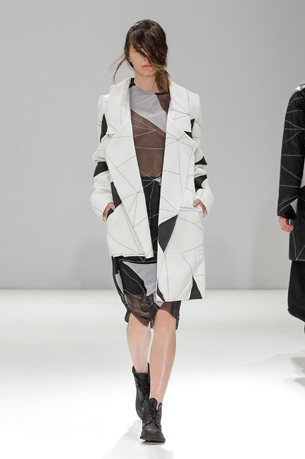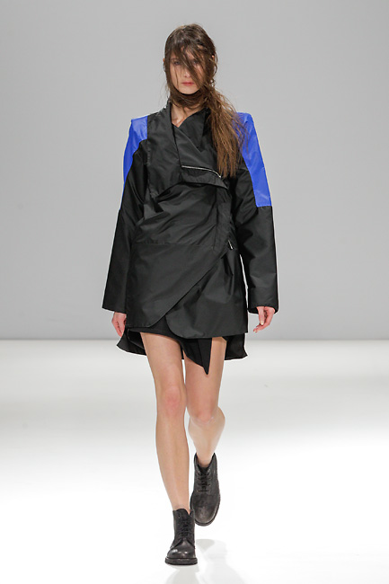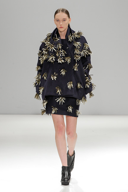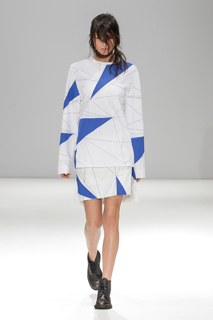 Daniela Barros levou a Londres a coleção “Dalka”, em que “apresenta uma silhueta forte e austera, onde a geometria e rigidez dos cortes aludem à química e à ligação dos seus elementos”. Num contraste entre materiais de cariz tecnológico e matérias de fibras naturais ou seda, a jovem designer explica que “a silhueta invoca a energia do caráter e do look feminino inspirado nas guerreiras históricas femininas, composta por várias camadas e linhas andrógenas”. “Blocos de cor são balançados por estampados que refletem a tridimensionalidade e visão microscópica; o preto e o cobalto são iluminados pelo branco”, acrescentou.