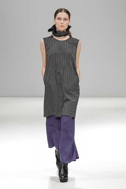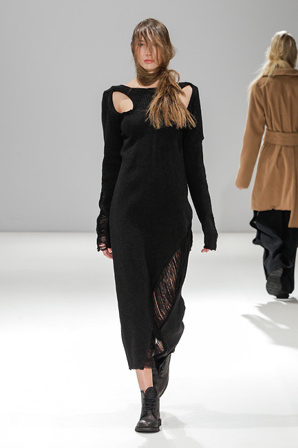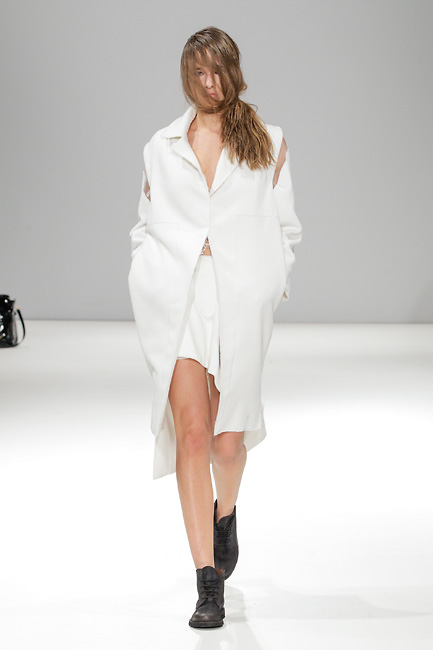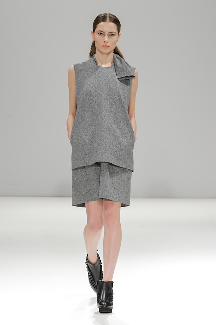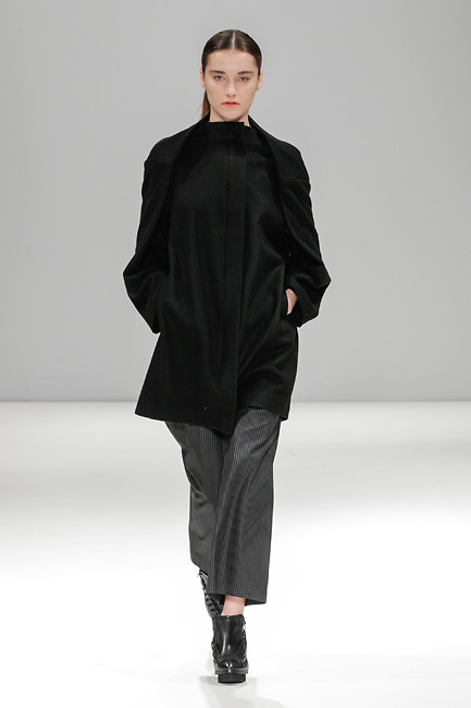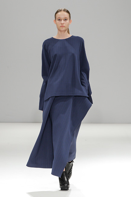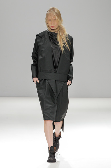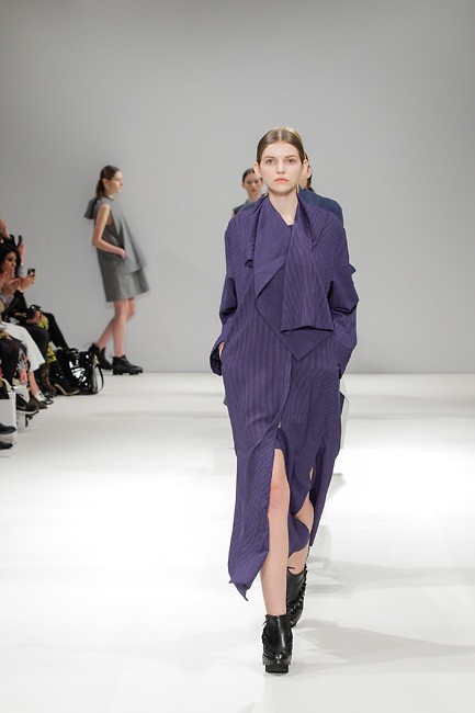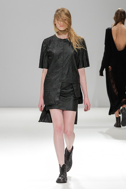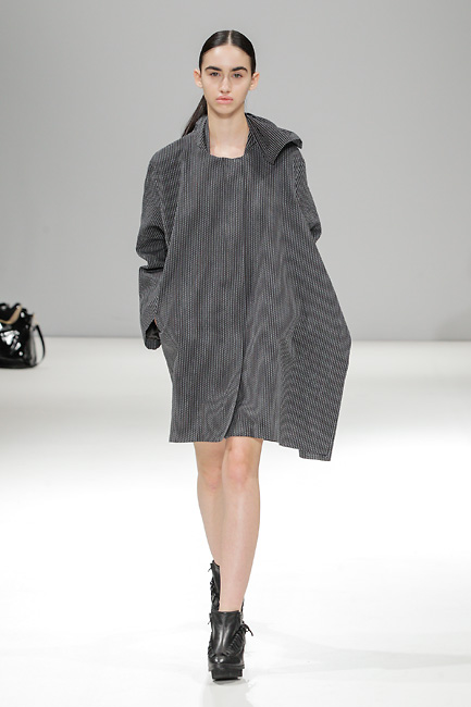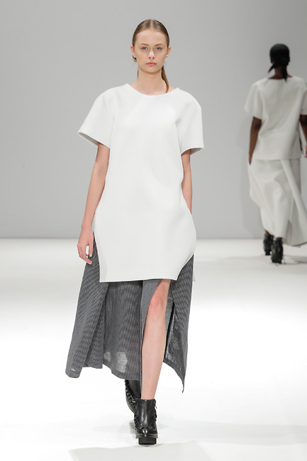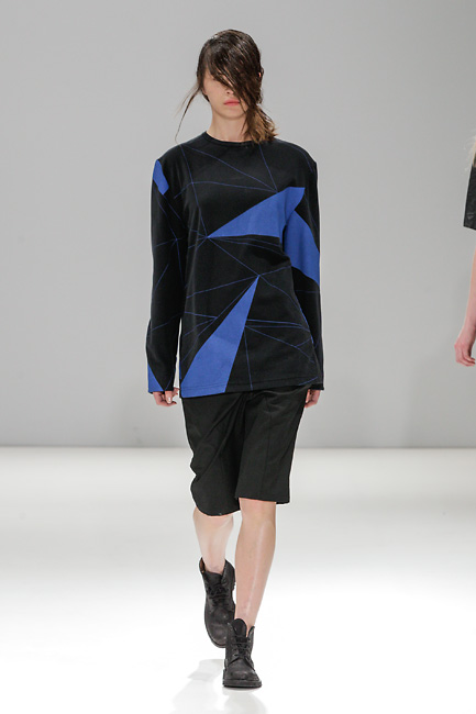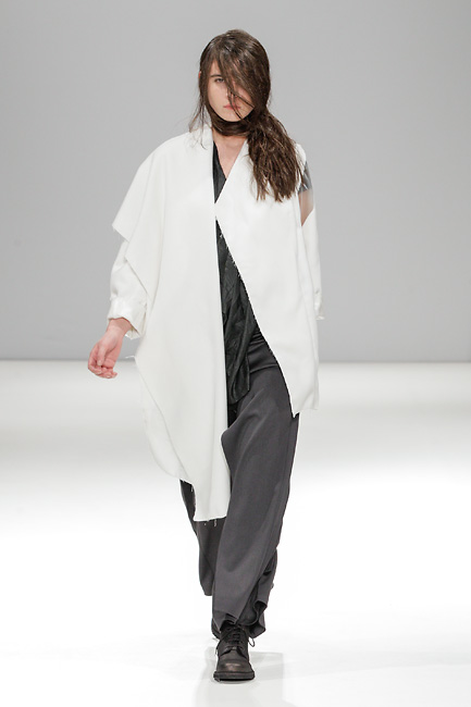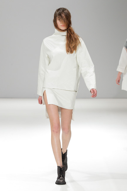 Daniela Barros levou a Londres a coleção “Dalka”, em que “apresenta uma silhueta forte e austera, onde a geometria e rigidez dos cortes aludem à química e à ligação dos seus elementos”. Num contraste entre materiais de cariz tecnológico e matérias de fibras naturais ou seda, a jovem designer explica que “a silhueta invoca a energia do caráter e do look feminino inspirado nas guerreiras históricas femininas, composta por várias camadas e linhas andrógenas”. “Blocos de cor são balançados por estampados que refletem a tridimensionalidade e visão microscópica; o preto e o cobalto são iluminados pelo branco”, acrescentou.