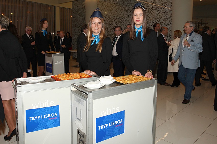 Os convidados foram surpreendidos à chegadas com uma Equipa de Hospedeiras e Comandantes, a servirem um cocktail com carrinhos de avião da “ Tryp Lisboa Airlines”.