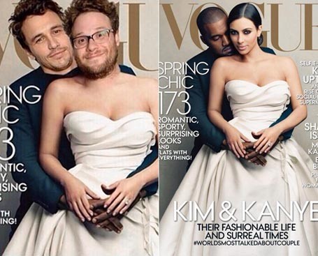Depois de terem feito uma versão própria do videoclipe de Kany West que conta com a participação de Kim Kardashian, James Franco e Seth Rogen voltaram a gozar com o casal do momento. Agora, a dupla de atores decidiu recriar a capa da revista. De imediato a imagem espalhou-se pelas redes sociais.
