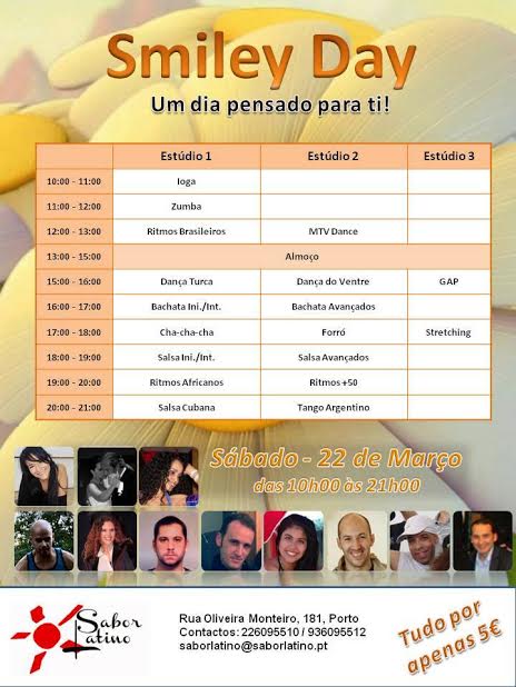 Se gosta de dançar e quer passar um dia divertido em família, a escola de dança Sabor Latino propõe-lhe um programa de diversão. A escola preparou para este sábado, dia 22, das 10h00 às 21h00, o “Smiley Day”. “Este evento é realizado de dois em dois meses, uma oportunidade em que as pessoas podem vir fazer aulas durante todo o dia, por apenas cinco euros. Temos atividades dedicadas aos adultos, às crianças e para as pessoas com mais idade”, explicou à Move Notícias Graça Pinto, proprietária da escola.