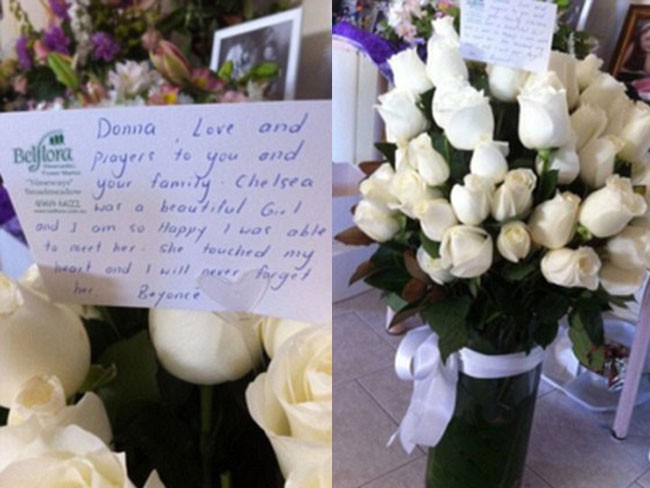 “Donna, amor e orações para si e sua família. Chelsea era uma menina linda e estou muito feliz que pude conhecê-la. Ela tocou o meu coração e nunca a esquecerei”, disse Beyoncé no bilhete, assinado pessoalmente por ela ao final da mensagem.