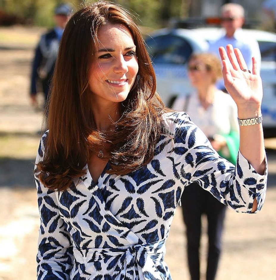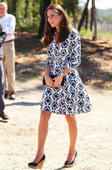 Para a ocasião, Kate escolheu um look casual chic. A mulher do príncipe William usou um vestido da estilista Diane von Furstenberg, completando o visual com os sapatos de cunha de cortiça Stuart Weitzman, que já usou em várias ocasiões.