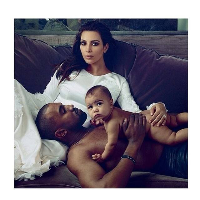 Kim Kardashian mostrou uma das fotos que tirou com o namorado, Kanye West, e a filha de ambos, North, para a sessão fotográfica da revista Vogue. No Facebook, a socialite escreveu “Vogue, família”.