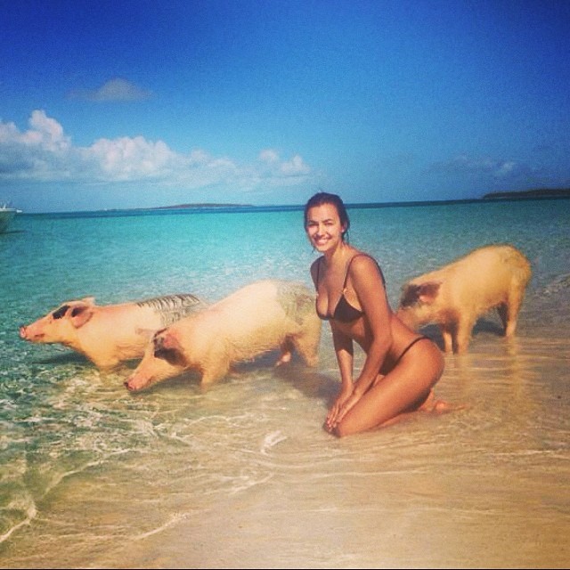 Nas fotografias, a top model russa, aparece de biquíni preto a nadar num mar azul-turquesa acompanhada de porcos. “Iri e os porcos nadadores #funday#ocean #safari”, escreveu a namorada de Cristiano Ronaldo na legenda.
