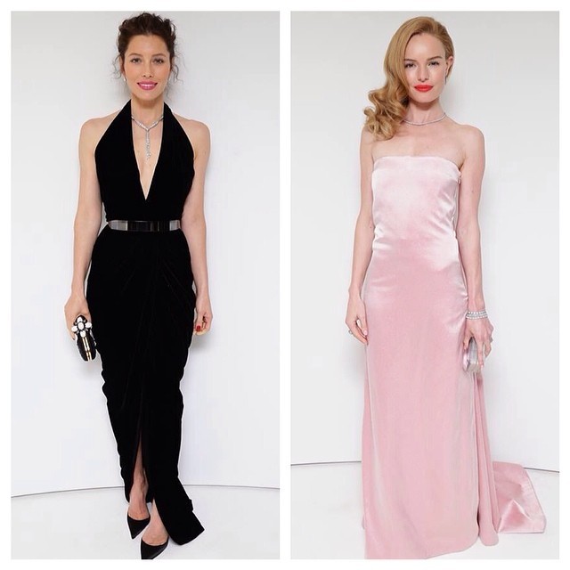 Kate Bosworth escolheu para a ocasião um vestido by Katie Ermilio, adornado com brincos, colar, pulseiras e uma clutch, além do batom vermelho. Um longo all black de veludo by Oscar de la Renta com fenda e um decote devidamente acompanhado de um precioso colar foi a opção de Jessica Biel. Com look mais descontraído, com um vestido Balenciaga, estava Katie Holmes.