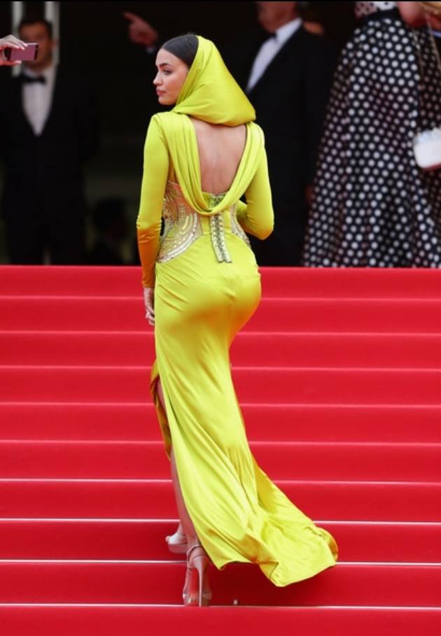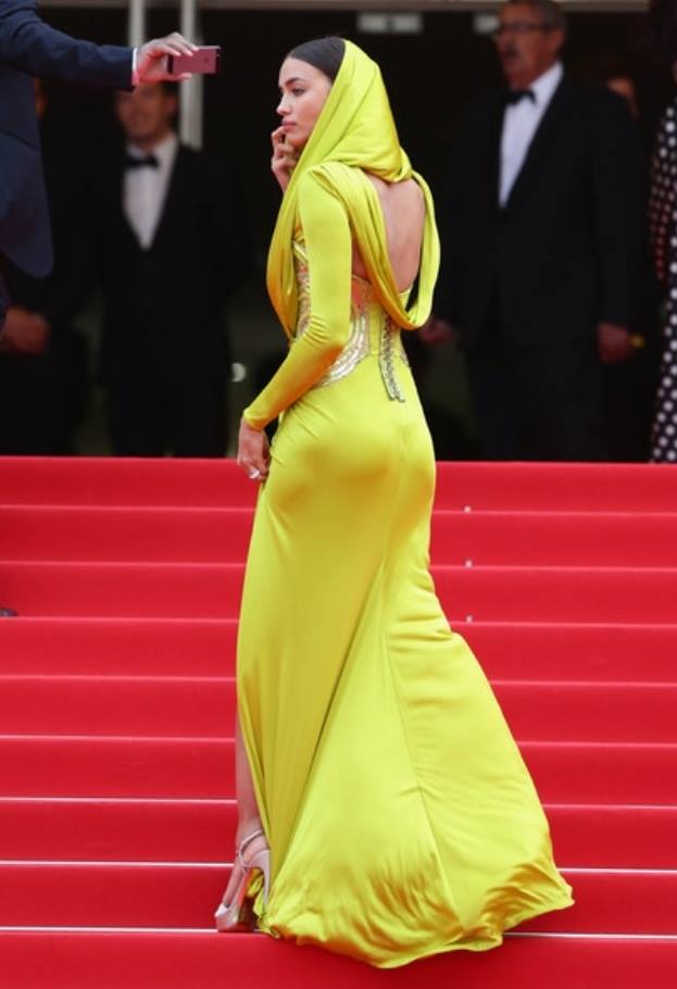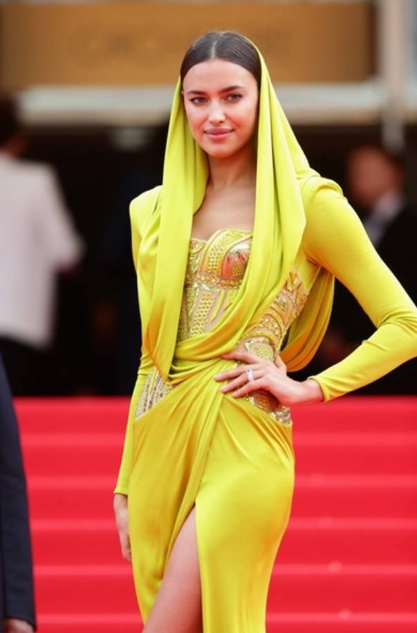 A manequim russa chamou à atenção na passadeira vermelha pelo seu look, que muitos consideraram ser excêntrico. Irina Shayk usou um vestido do Atelier Versace longo de seda amarela com uma fenda enorme na perna e uma espécie de lenço que saía do vestido e cobria parte da cabeça.
