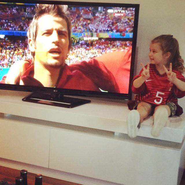 Numa das fotos, a filha do casal, Vitória, surge ao lado da televisão, que estava a emitir o momento em que Fábio cantava o hino nacional.