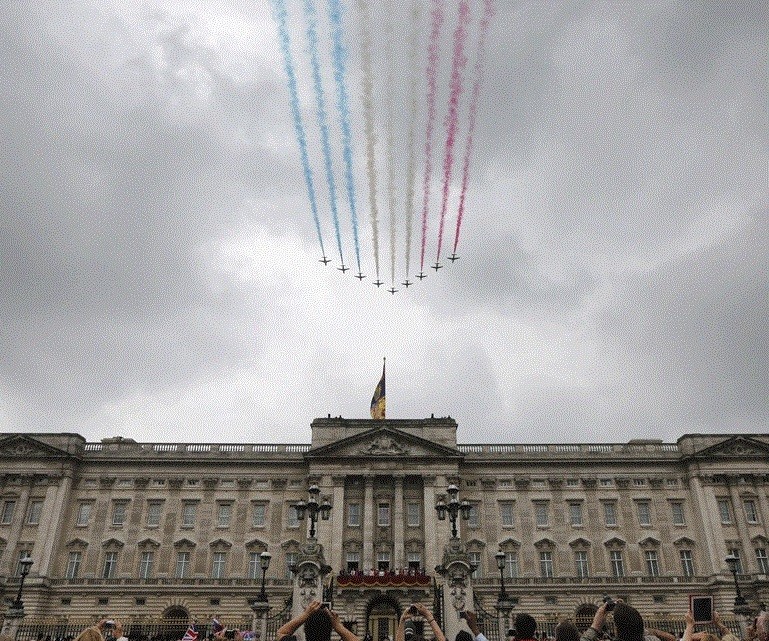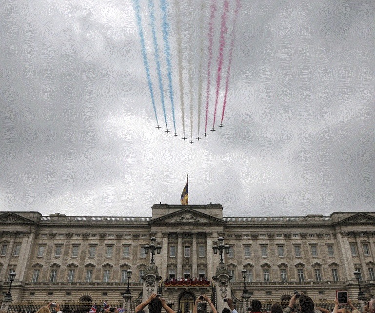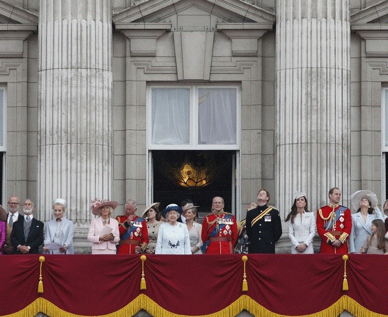 Como de costume todos se juntaram, no final, na varanda do Palácio de Buckingham, onde saudaram o voo da Força Aérea.