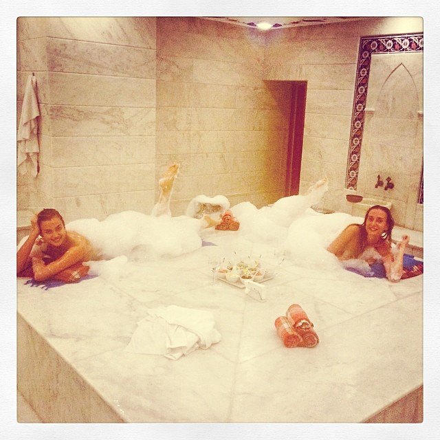 Na foto, Irina Shayk surge ao lado de uma amiga, deitada e apenas coberta com espuma. “Tempo para um banho turco”, escreveu na legenda.