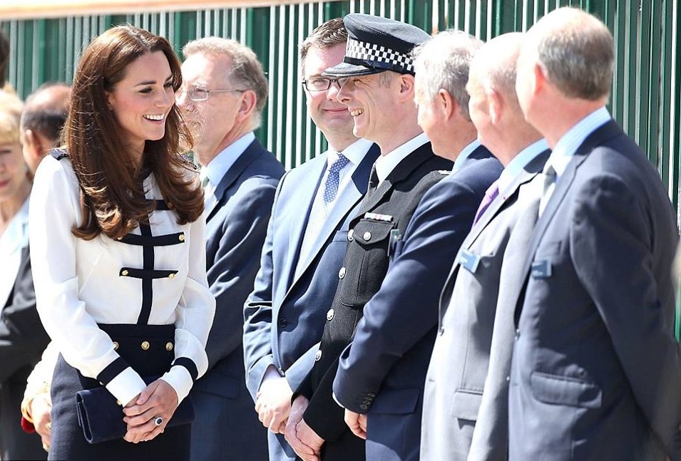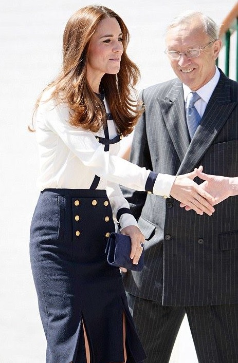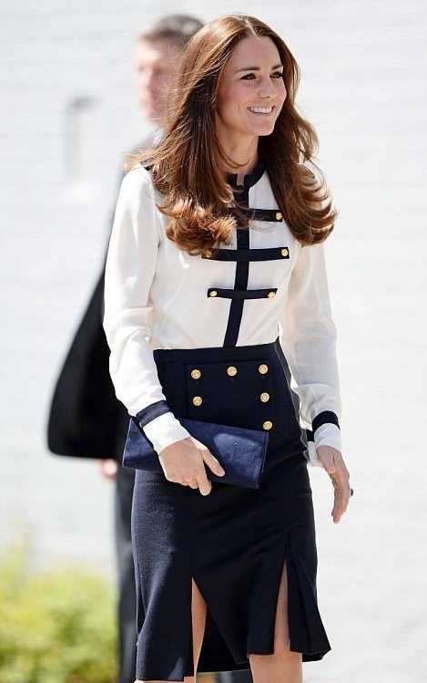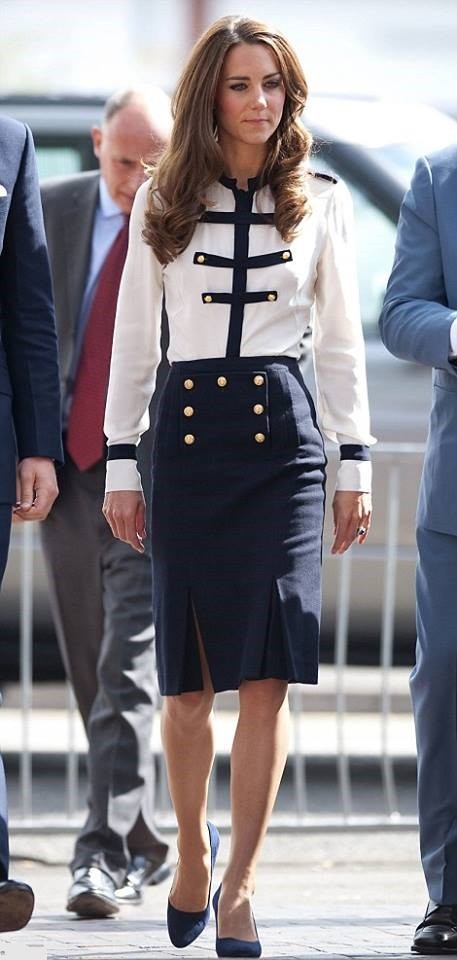 Mais uma vez, a duquesa optou por um look reciclado e usou uma blusa branca e uma saia azul marinho de Alexander McQueen. Kate já havia usado este visual em 2011, durante uma visita ao Centro Comunitário Summerfield, em Birmingham.