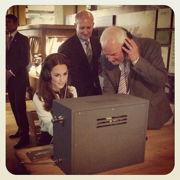 Na sua visita, a mulher do príncipe William aproveitou para aprender a decifrar o código Morse e usou uma réplica de um rádio da década de 40.