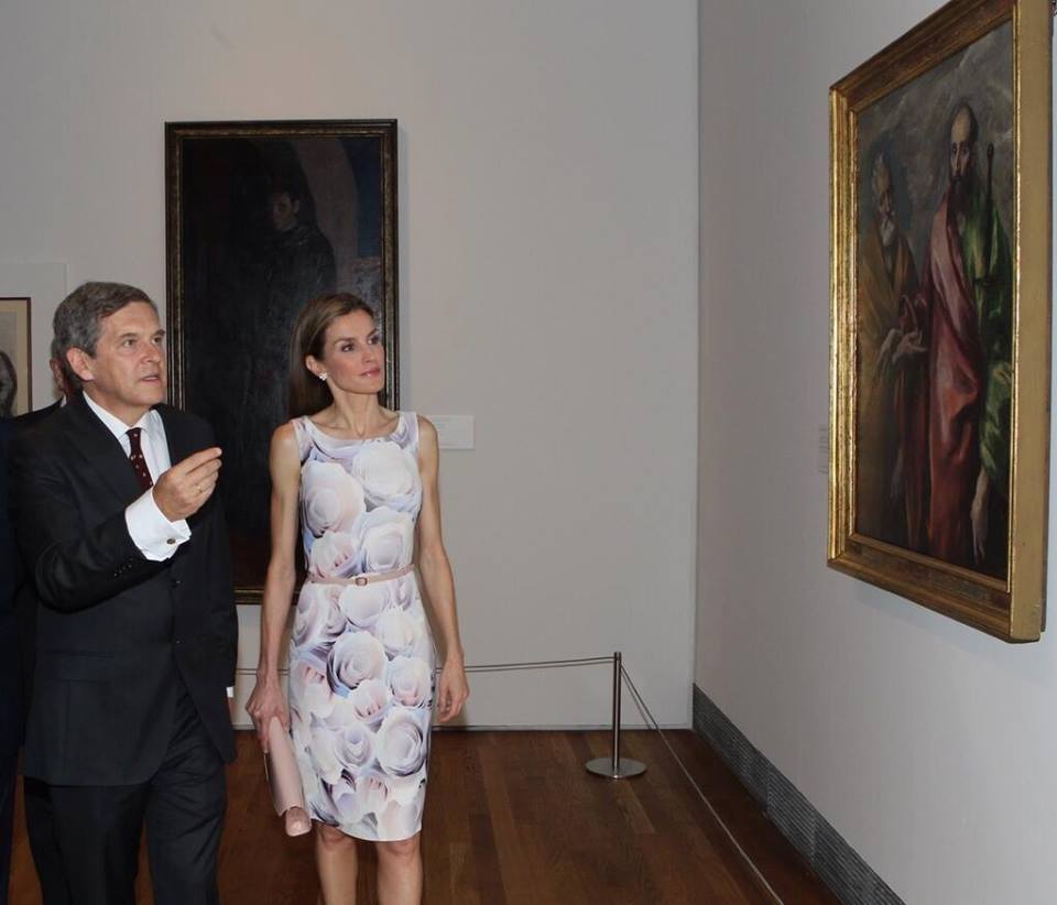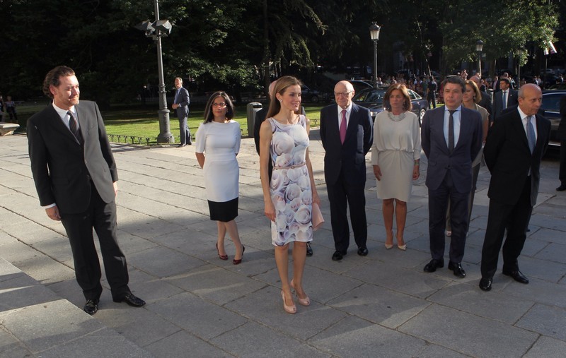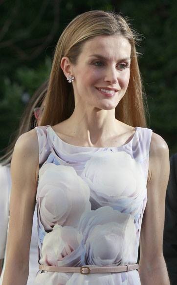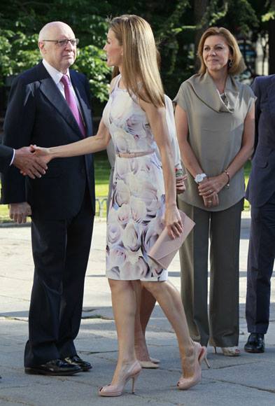 Para a ocasião a rainha estreou um vestido Hugo Boss, com estampado de flores, mostrando que continua fiel às suas marcas preferidas mesmo depois da ascensão ao trono. O modelo custa 440 euros. Para completar o look Letizia usou uma clutch Felipe Varela de 500 euros e uns peep-toes Magrit, de 200 euros. No total o visual da rainha custou 1140 euros.