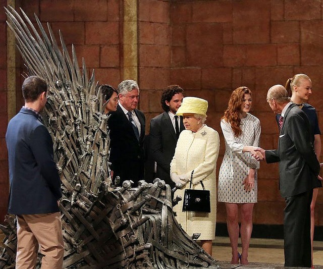 A monarca, acompanha do marido, o príncipe Phillip, esteve com alguns dos atores da série como Maisie Williams, que interpreta Arya Stark, Kit Harington, o Jon Snow, e Lena Headey, a rainha Cersei Lannister.