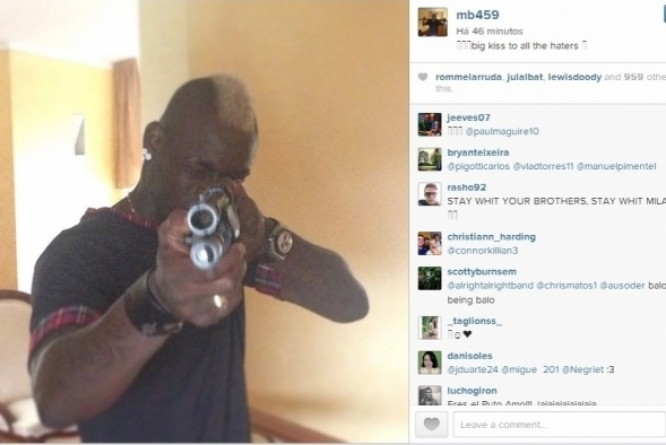 Na imagem, que entretanto foi apagada, Mario Balotelli surge a apontar para a câmara com o que parece ser uma espingarda. Na legenda, o internacional italiano escreveu: “Big kiss to all the haters” (“Grande beijo aos inimigos”).