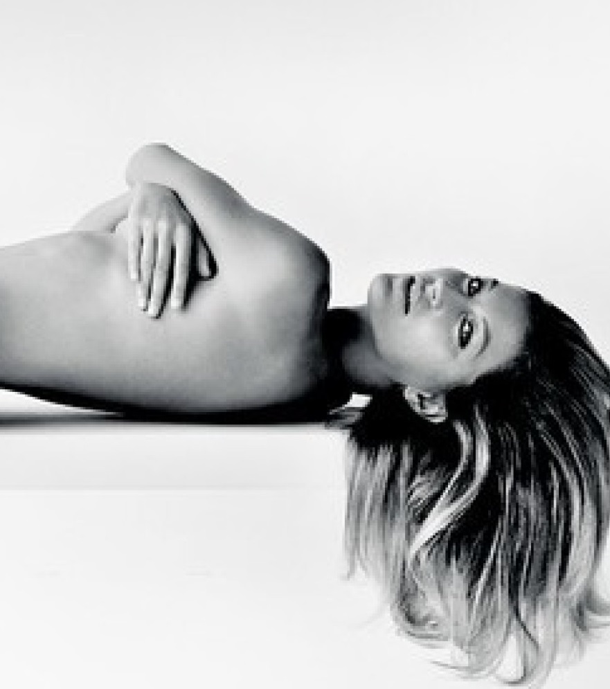 Fotografada por Mario Testino, Gisele Bündchen surge numa das imagens em topless, numa pose sensual.