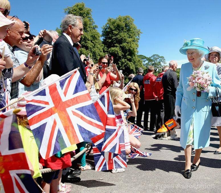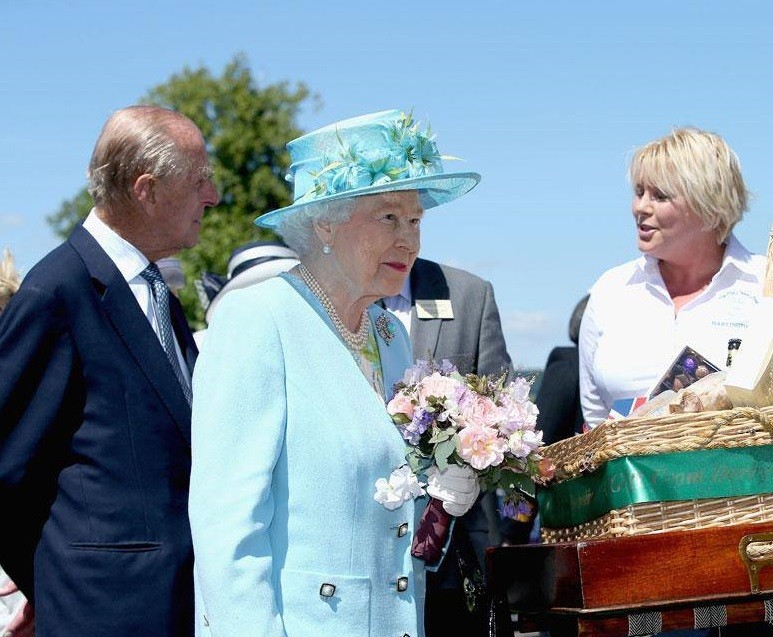 Acompanhada do marido, o duque de Edimburgo, a rainha recebeu peças de malha para o neto, o príncipe George, que completa um ano no próximo dia 22.