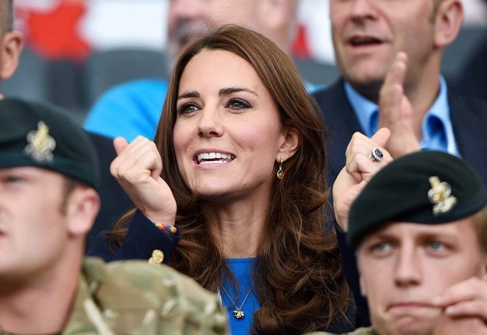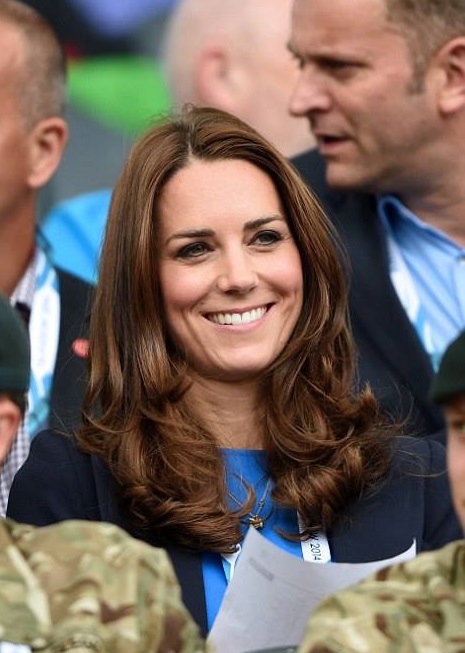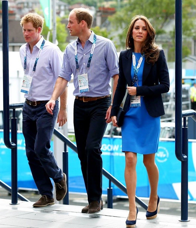 A duquesa de Cambridge compareceu na companhia do marido e do cunhado aos jogos da Commonwealth, em Glasgow, na Escócia. Para a ocasião, Kate Middleton reciclou um vestido azul electro da estilista Stella McCartney, que já havia usado em 2012, em outras duas situações.