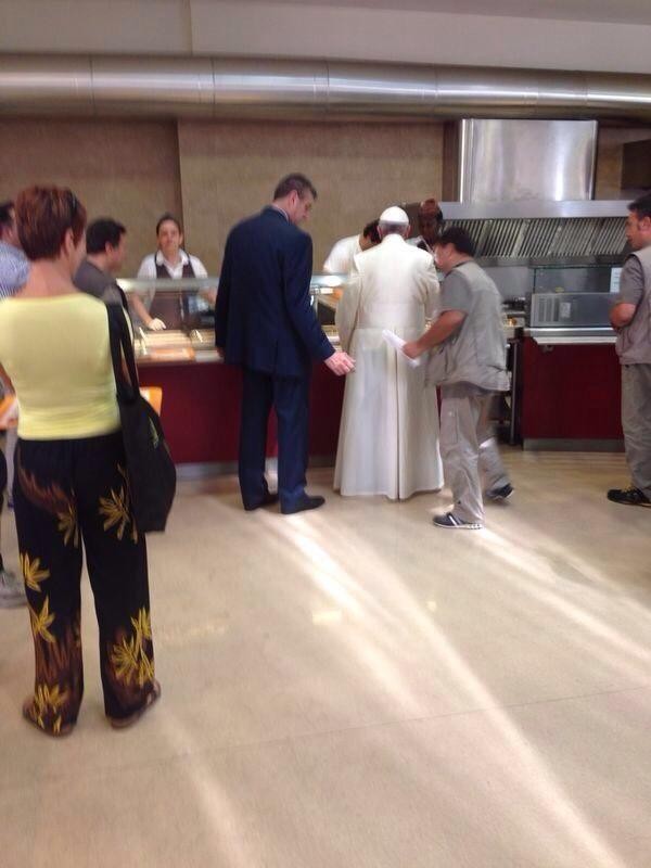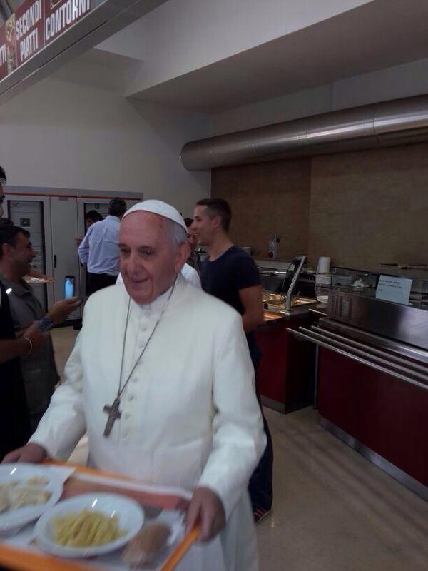 Em regime self service, o Papa não quis privilégios em relação aos outros e pegou no seu próprio tabuleiro.