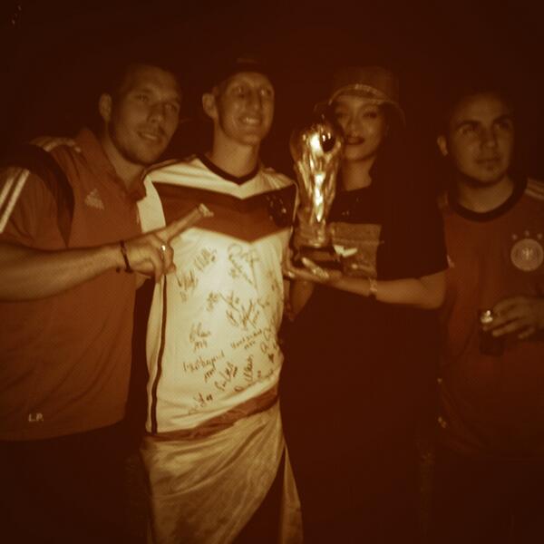 Rihanna assistiu no estádio do Macaranã, no Rio de Janeiro, à vitória da Alemanha frente à Argentina (1-0) na final do Mundial. A cantora torceu pela seleção germânica e no final esteve com o cobiçado troféu nas mãos. “Toquei a taça, segurei a taça, beijei a taça, fiz uma selfie com a taça… Ou seja…”, escreveu na rede social.