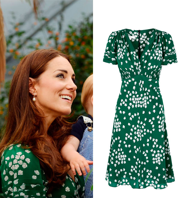 Kate elegeu um vestido verde estampado da marca Suzannah, que custa cerca de 660 euros.