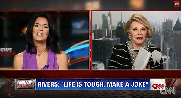A comediante e apresentadora saiu durante a conversa com Fredricka Whitfield, alegando que a entrevista se tinha tornado “defensiva” e “negativa”. A discussão surgiu quando se falava sobre as críticas feitas no programa do canal E!, “Fashion Police”, apresentado por Rivers.