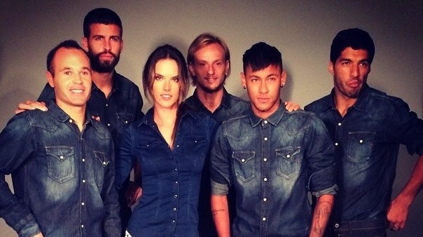Gerard Piqué, Ivan Rakitic, Luis Suárez, Neymar e Andrés Iniesta posaram ao lado de Alessandra Ambrosio para a nova campanha da Replay.
