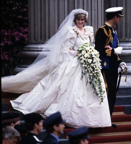Feito de seda, tafetá e renda o vestido foi criado por David e Elizabeth Emanuel. Possui uma cauda de 7,6 metros e 10 mil pérolas. O casamento teve lugar na Catedral St. Paul, no dia 29 de Julho, de 1981. Foi realizado pelo Bispo de Canterbury que o descreveu como “um conto de fadas”. A cerimónia foi vista na televisão no mundo inteiro por mil milhões de pessoas.