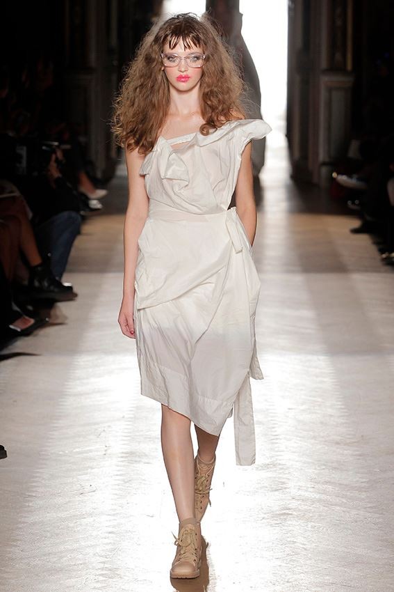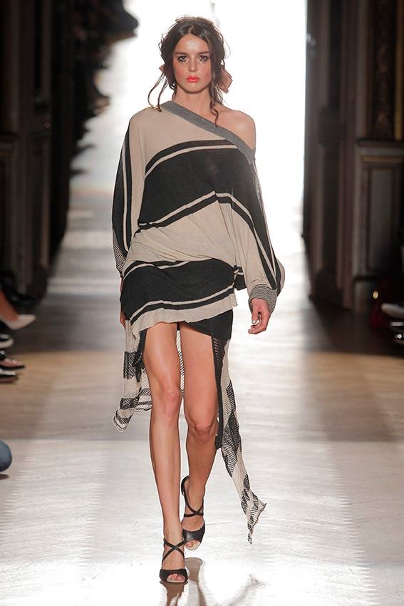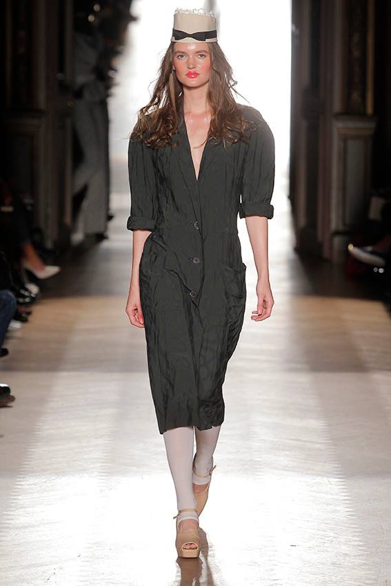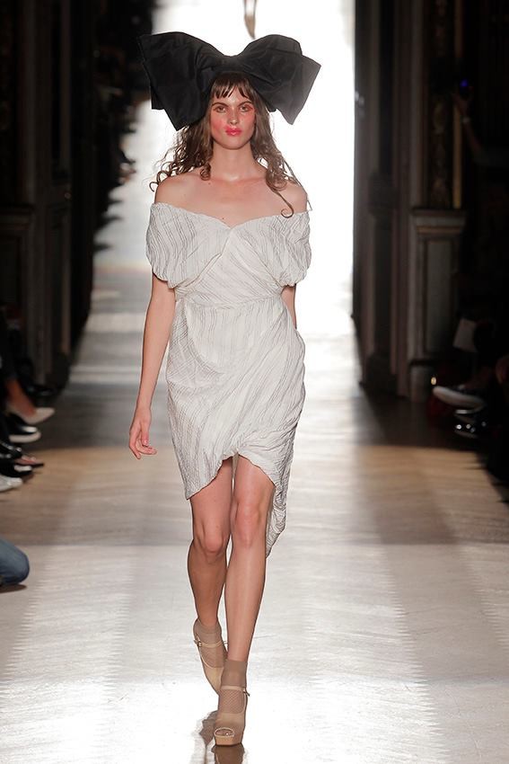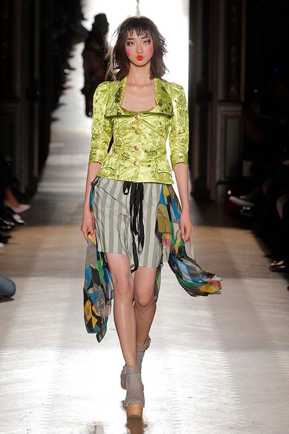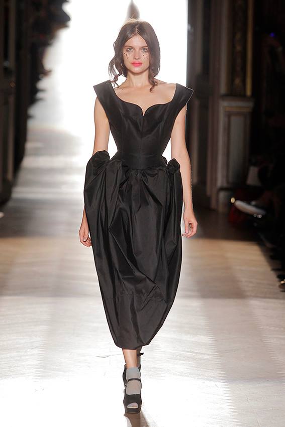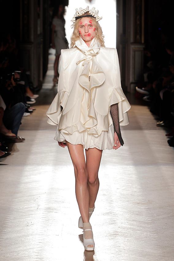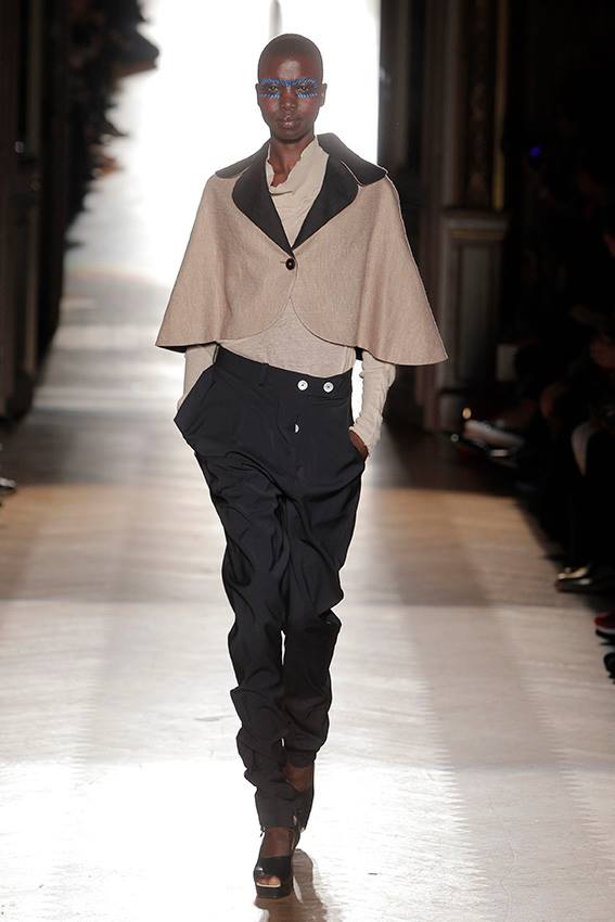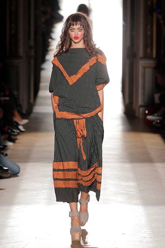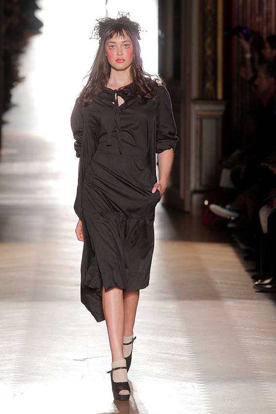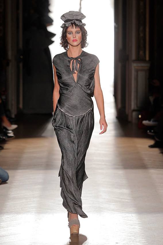 A estilista investiu em cortes assimétricos e as modelos desfilaram com maquilhagem esborratada, conferindo um toque de excentricidade ao desfile.