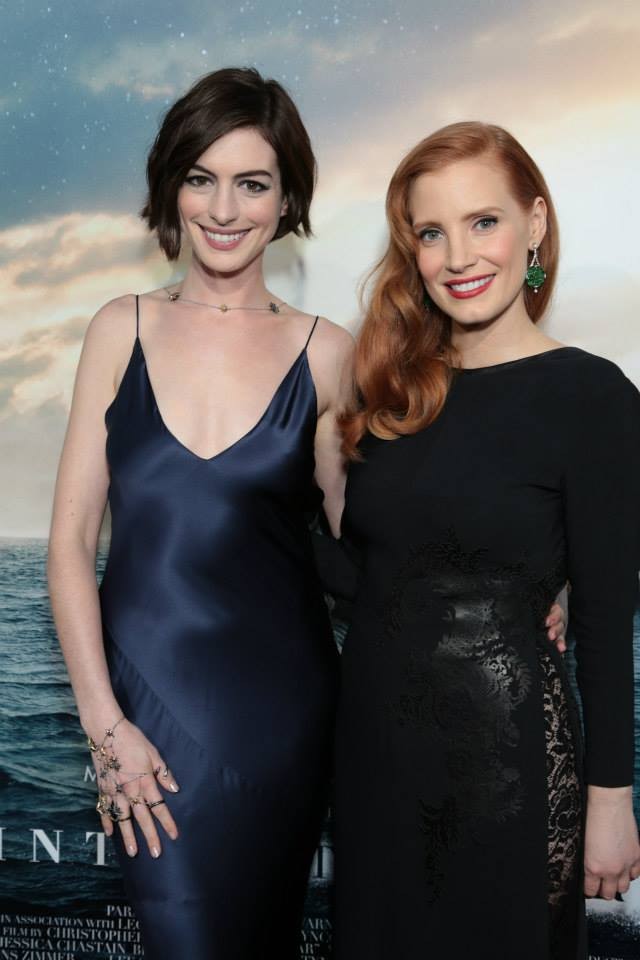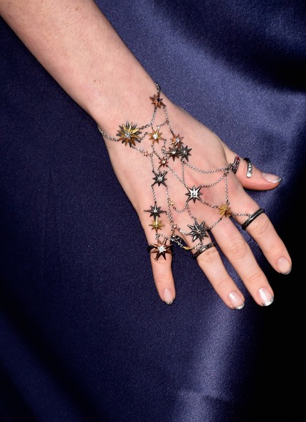 Mas foi Hathaway quem chamou mais à atenção. Tudo por causa de um acessório que a atriz usou. Para acompanhar o vestido longo de cetim de Richard Nicoll, a estrela apostou em joias de James Banks Design, que não passaram despercebidas enquanto posava para os fotógrafos: uma pulseira de mão repleta de estrelas, que subiam até os dedos coordenada com um colar usado para enfeitar o decote nas costas.