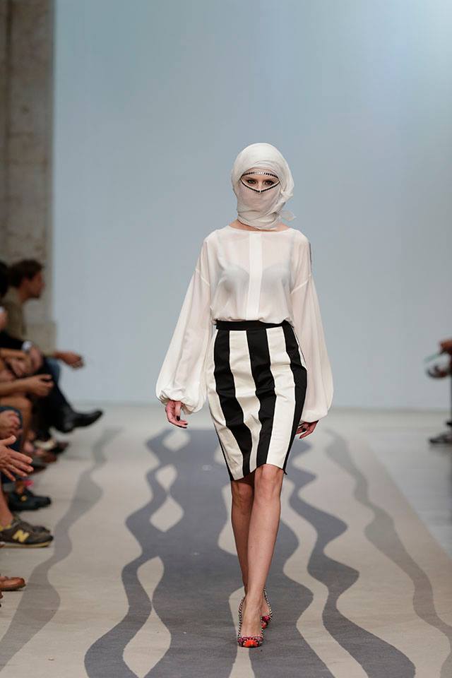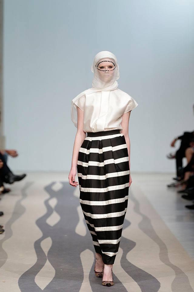 Ao estilo das Arábias, as modelos desfilaram com a cara e a cabeça cobertas por um véu. O estilista apostou no preto e branco a próxima estação quente.