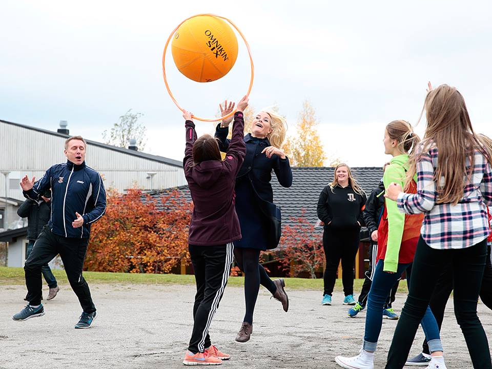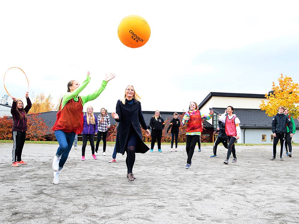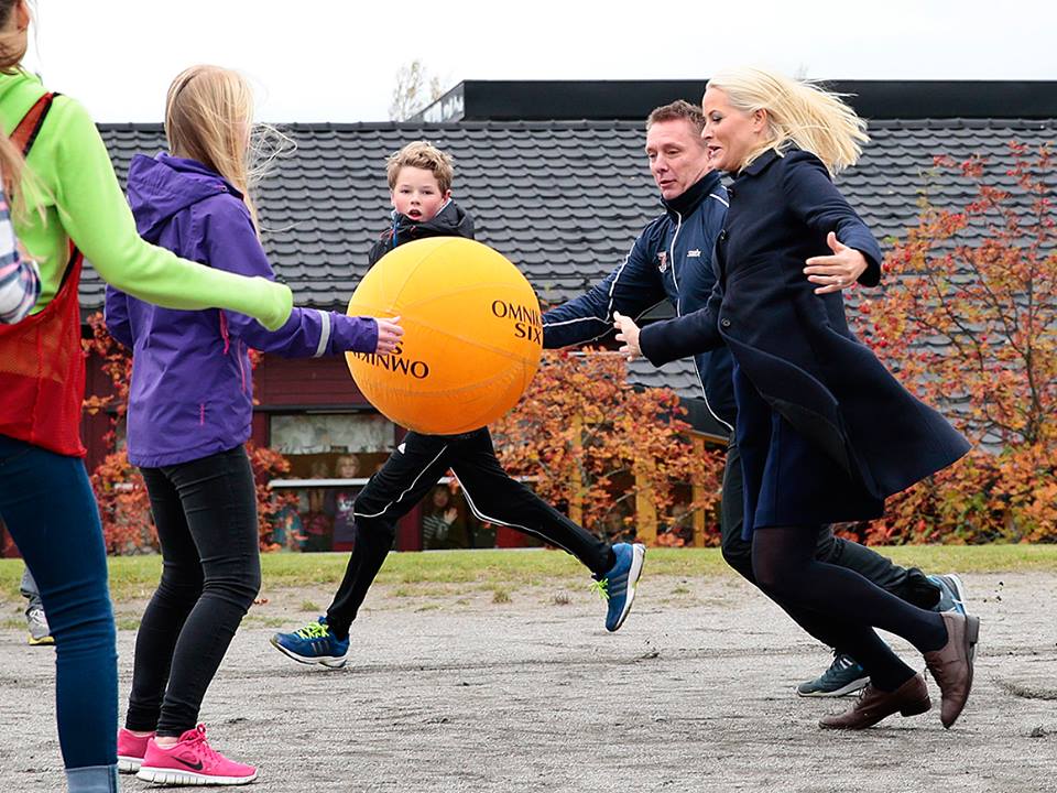 Sorridente e divertida, a princesa Mette-Marit animou um grupo de jovens durante a sua visita a um complexo desportivo de uma escola nos arredores de Oslo.