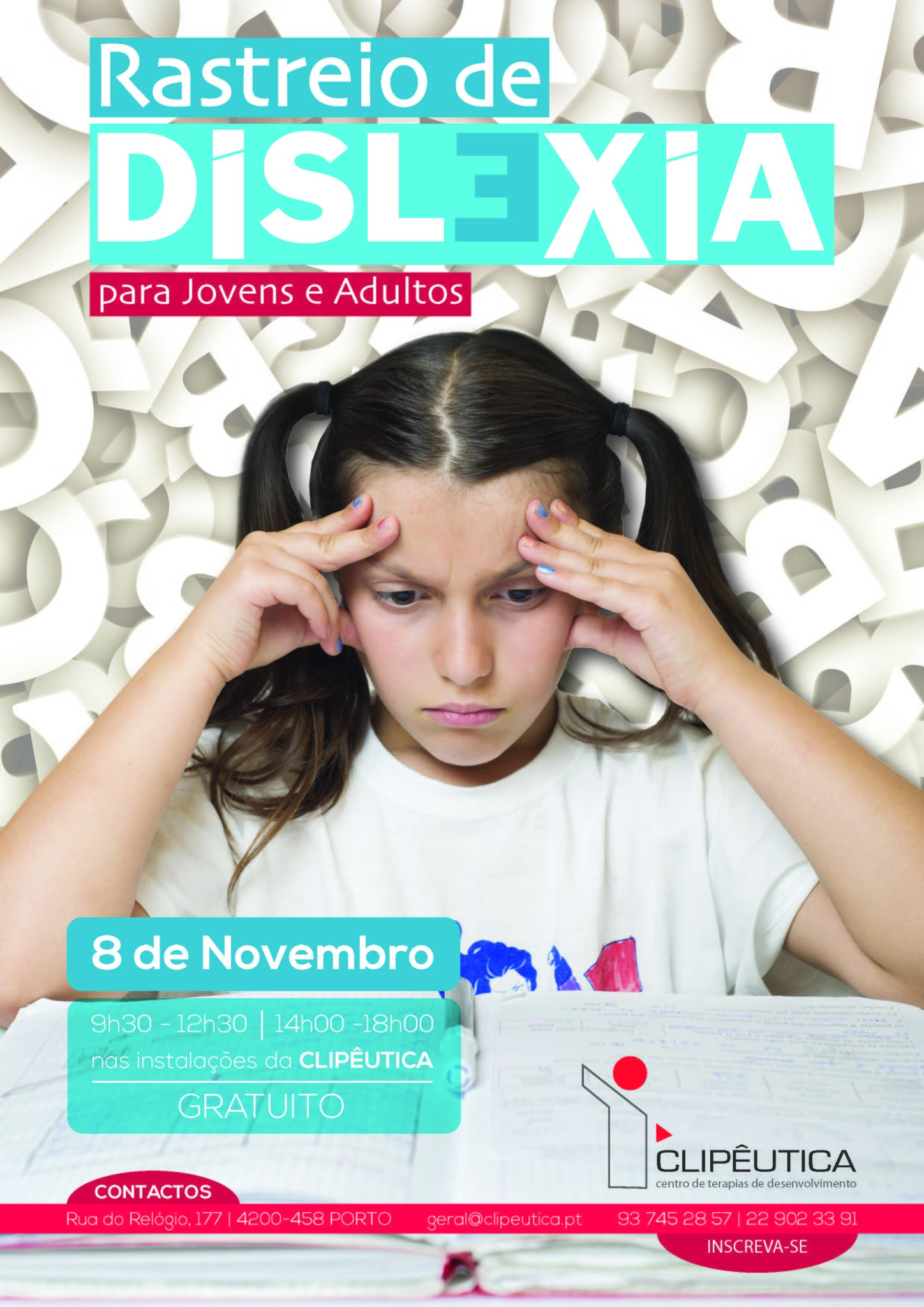 No sentido de assinalar o Dia Nacional da Dislexia, a Clipêutica – Centro de Terapias de Desenvolvimento – realiza mais um Rastreio de Dislexia, destinado a jovens e adultos, assim como a crianças em idade escolar, coordenado por Maria Amélia Dias-Martins, especialista nesta patologia.