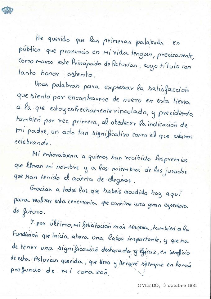 Foi aos 13 anos que Felipe presidiu pela primeira vez a esta cerimónia, em 1981. A Fundação Príncipe das Astúrias divulgou o discurso de Felipe escrito à mão nas redes sociais.