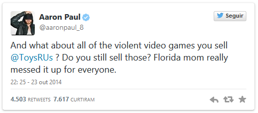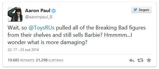 “Esperem. Então a ToysRUs retirou os bonecos do ‘Breaking Bad’ das suas prateleiras mas continua a vender a Barbie? Hmmm….questiono-me sobre o que será mais perigoso?”, escreveu no Twitter. “Então e todos os videojogos violentos? Ainda continuam a vender isso?”, acrescentou numa nova publicação.