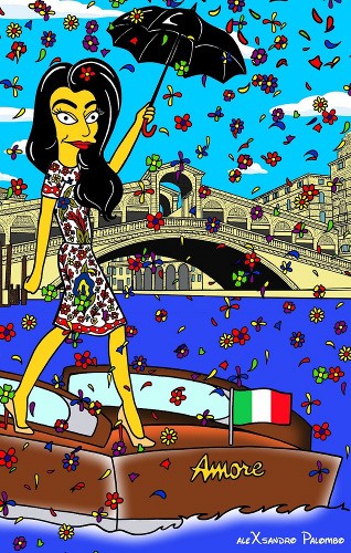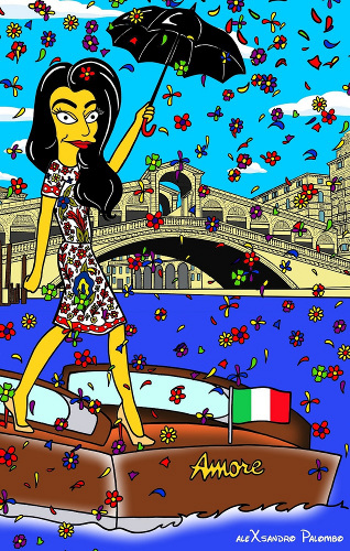 O cenários dos desenhos são sempre os canais de Veneza e o taxi aquático “Amore”, que transportou o casal na cidade italiana durante quatro dias.