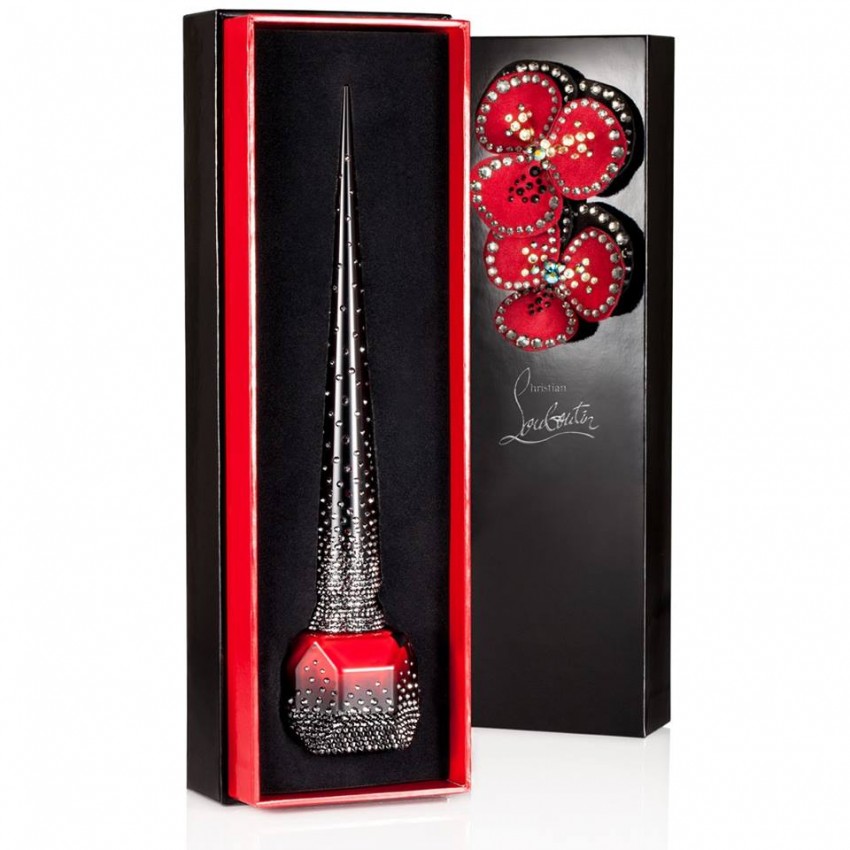 Com a mesma embalagem – com tampa pontiaguda, que tem o tamanho do salto mais alto que já foi criado por Christian Louboutin (20,5 centímetros) –, o verniz surge coberto por mais de 1.800 cristais aplicados à mão.